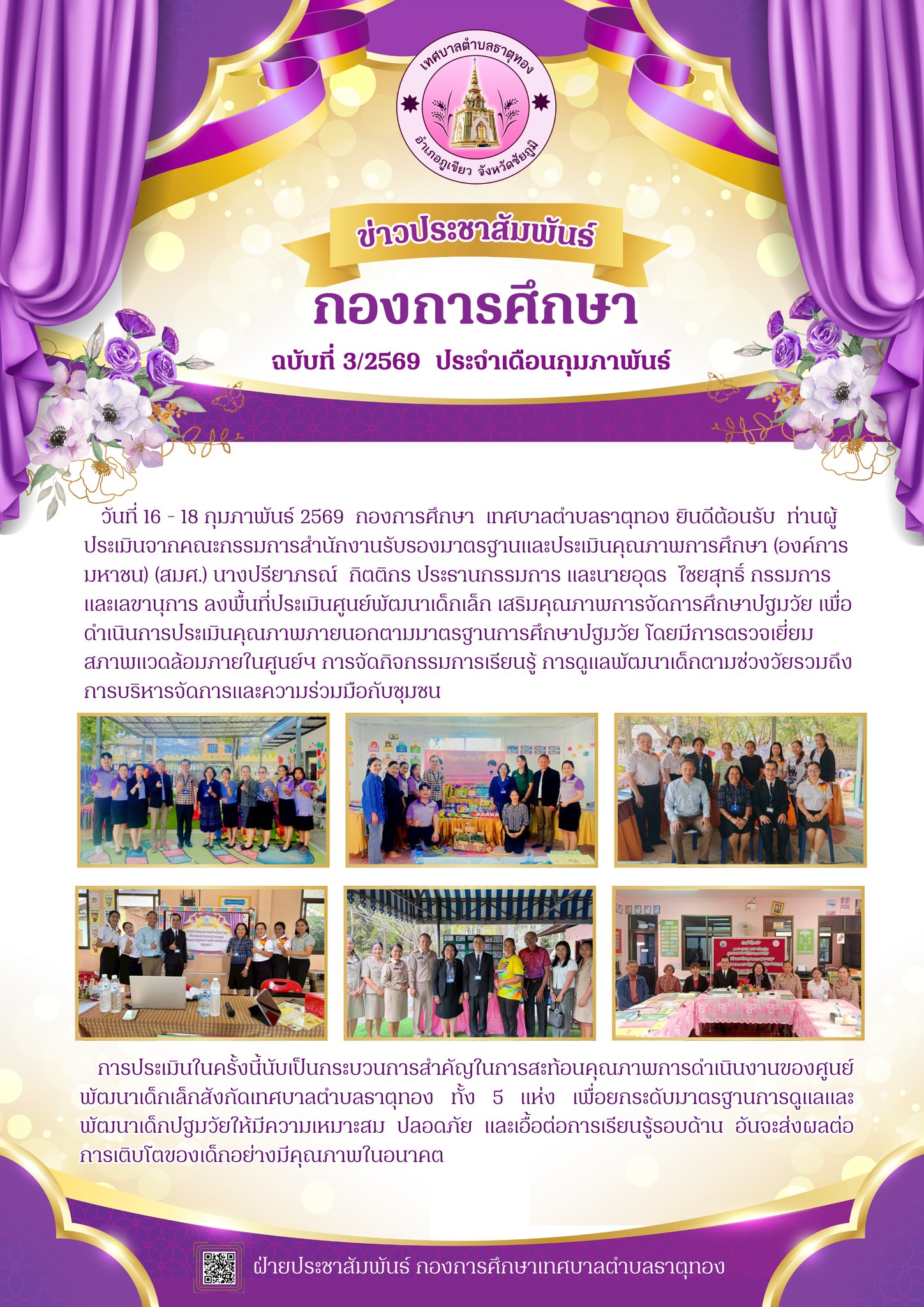 คณะกรรมการสำนักงานรับรองมาตรฐานและประเมินคุณภาพการศึกษา (องค์การมหาชน) (สมศ.) ได้เข้าประเมินและตรวจคุณภาพการศึกษา ณ ศูนย์พัฒนาเด็กเล็กทั้ง 5 แห่ง ในสังกัดเทศบาลตำบลธาตุทอง ระหว่างวันที่ 16 - 18 กุมภาพ
