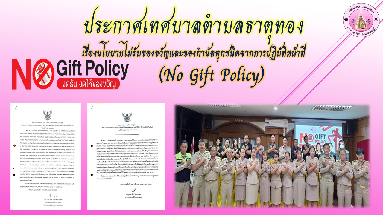 - มอบนโยบายปฏิเสธการรับของขวัญและของกำนัลทุกชนิดจากการปฏิบัติหน้าที่ (No Gift Policy)