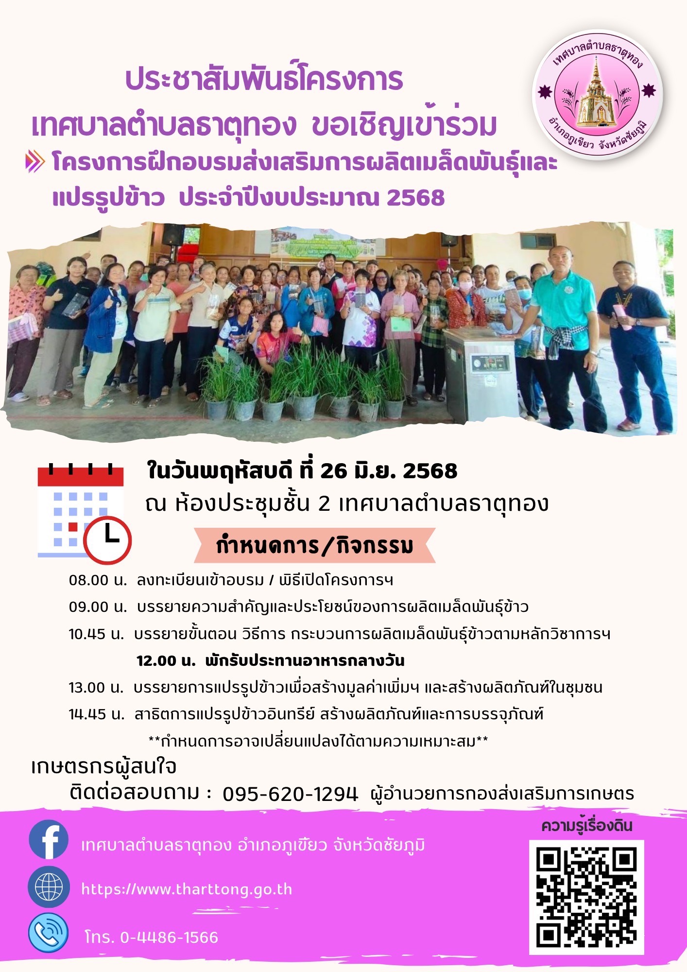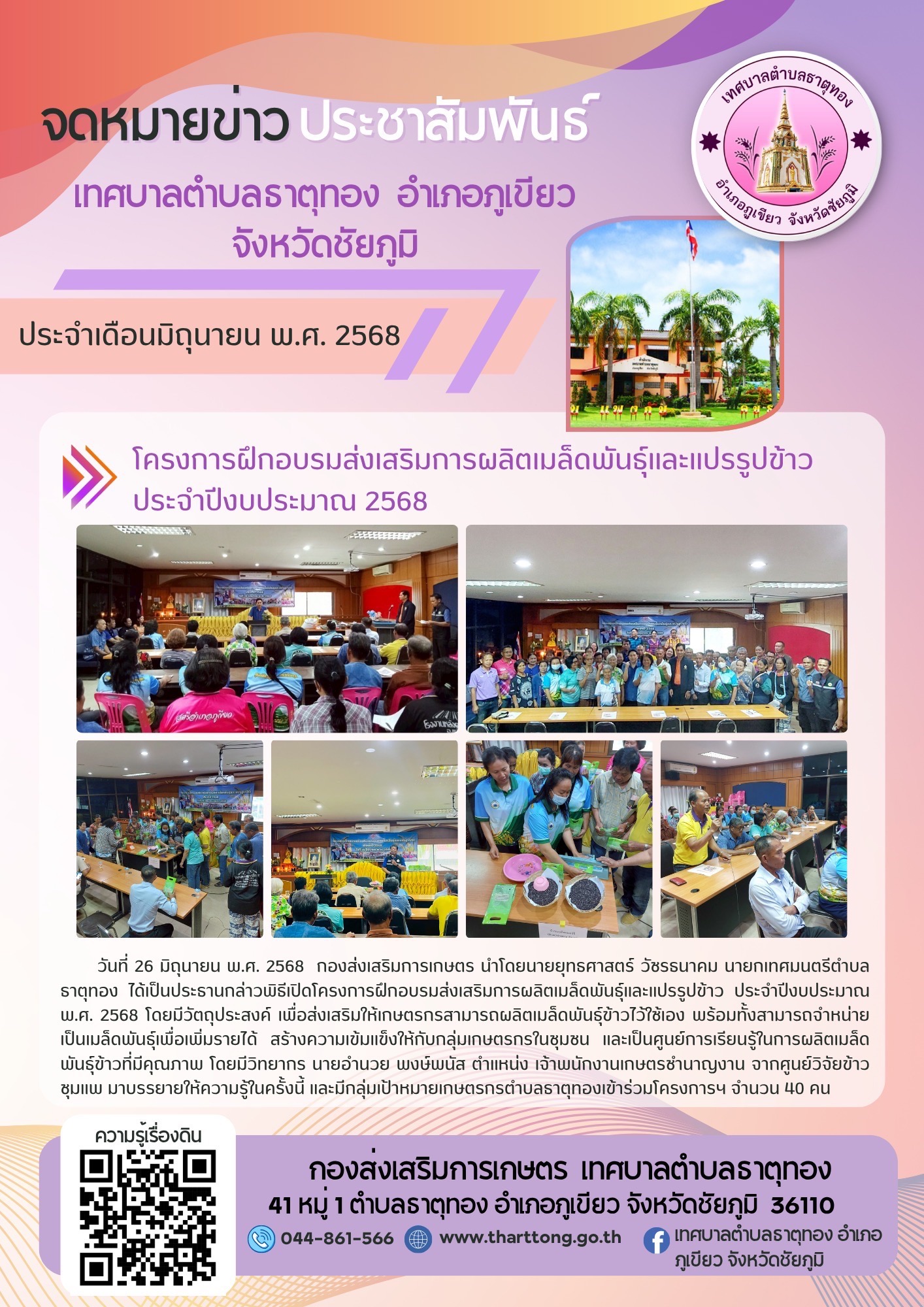 วันที่ 26 มิถุนายน 2568 กองส่งเสริมการเกษตร ดำเนินการจัดโครงการฝึกอบรมส่งเสริมการผลิตเมล็ดพันธุ์และแปรรูปข้าว ประจำปีงบประมาณ พ.ศ.2568 ณ ห้องประชุมชั้น 2 เทศบาลตำบลธาตุทอง การดำเนินงานเป็นไปด้วยความเรียบร้อย