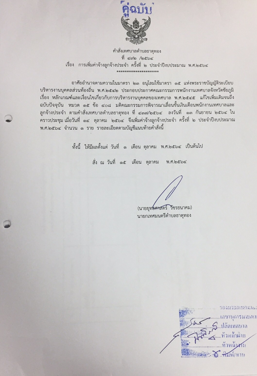 คำสั่งเทศบาลตำบลธาตุทอง เรื่อง ให้พนักงานจ้างตามภารกิจได้รับเงินเพิ่มการครองชีพชั่วคราว |